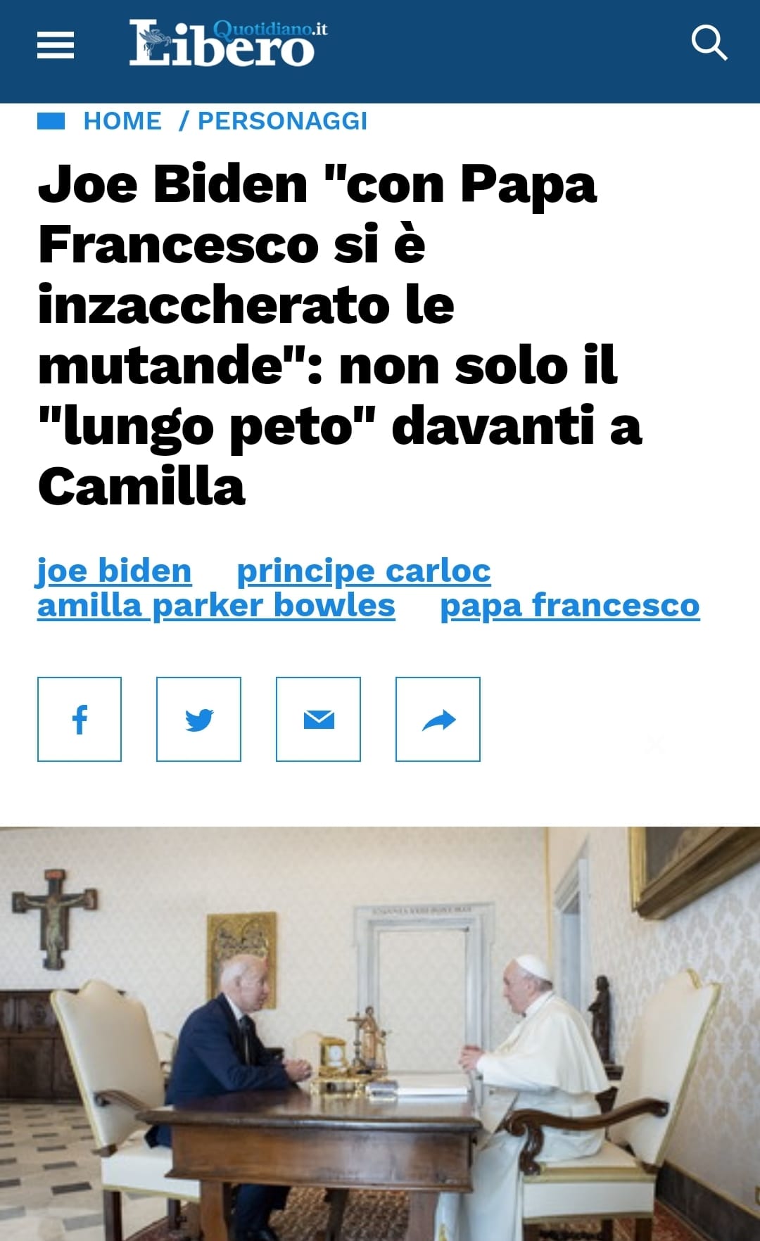 Biden, Camilla e il Papa finiti nella rete di un giornalismo da quattro soldi a caccia di click e di figure di m… Secondo il Daily Mail, il presidente degli Stati Uniti, Joe Biden, avrebbe avuto problemi di aria nella pancia. Insomma avrebbe emesso un peto rumoroso in presenza dei grandi della terra al recente Cop26 di Glasgow. Una notizia che incredibilmente ha fatto il giro dei quotidiani di tutto il mondo.