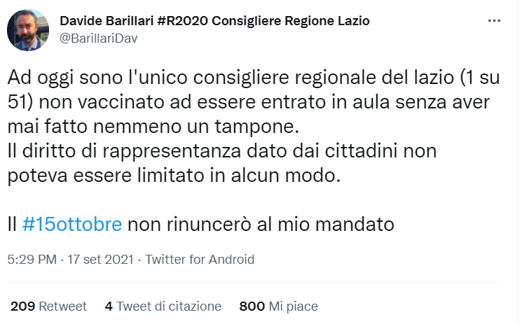 Con questo post sul suo account Twitter, il consigliere regionale Barillari, ex M5s, ha raccontato la vicenda che lo ha visto tristemente protagonista. Bloccato dalla vigilanza e respinto all’ingresso, il consigliere regionale del Lazio Davide Barillari non è potuto entrare nell’aula della Pisana perché sprovvisto di Green pass.
